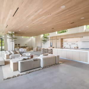 With large gallery walls of sandblasted travertine and Roman clay plus floor-to-ceiling Fleetwood glass doors, oak millwork and clerestory windows, the rooms are filled with the warm glow of natural light. Surrounded by expansive patios, an infinity pool and wraparound decks, the six-bedroom residence provides numerous settings for comfortable living and impressive entertaining.